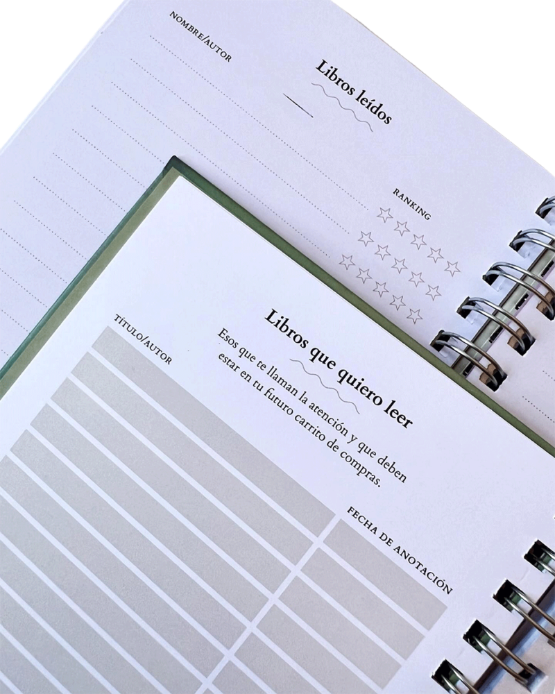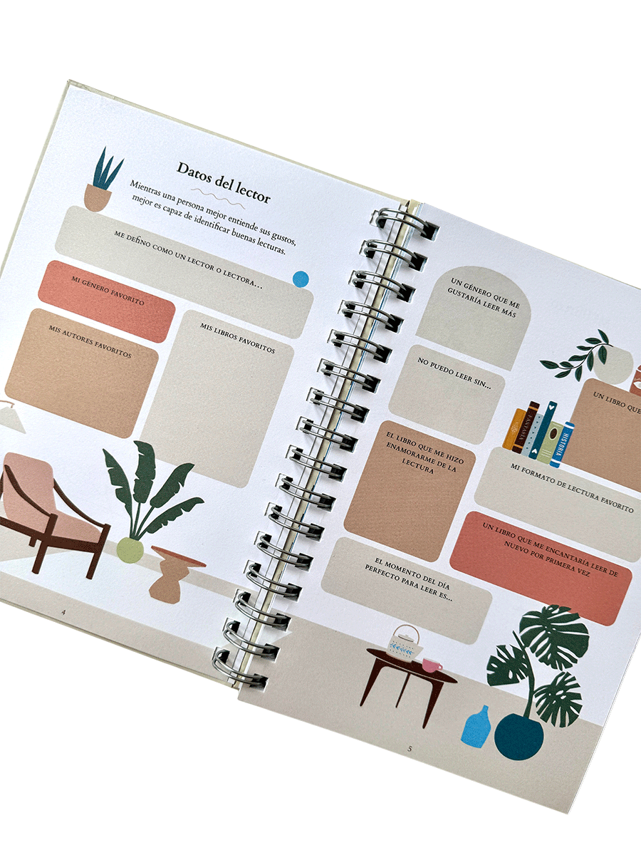 En la primera sección de tu diario de lecturas encontrarás páginas especiales para anotar tus datos como lector/a, pintar tu propio librero, una larga lista de deseos para tus futuras compras, un desafío de lectura y una lista para que vayas anotando de forma práctica tus libros leídos.